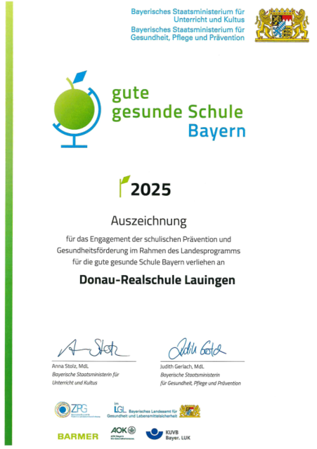 Das Landesprogramm für die gute gesunde Schule wurde zum fünften Mal bayernweit durchgeführt. Unsere Schule hat bereits zum dritten Mal die Auszeichnung erhalten.