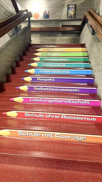 Um sich täglich daran zu erinnern, wie wir für ein positives Miteinander einstehen können und welche Werte dabei wichtig sind, haben sich die Klassensprecherinnen und -sprecher auf der letzten Versammlung viele Gedanken gemacht. Zusätzlich sollte erkannt werden, dass auch unsere Schülerinnen und Schüler die Möglichkeit innerhalb der SMV haben, das Schulleben aktiv mitzugestalten. So wurde sich auf Basis der Wertearbeit dafür entschieden, die Werte sichtbar an den Treppen zu machen, um ebenso ein Zeichen gegen Rassismus und für Demokratie zu setzen, denn hierbei ist besonders die Teilhabe wichtig.