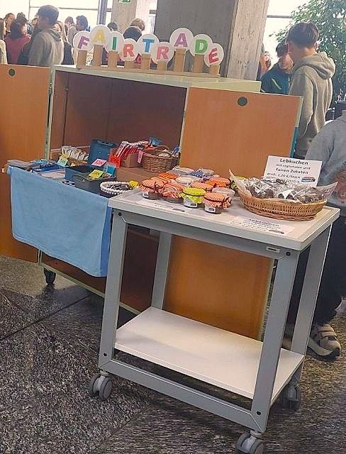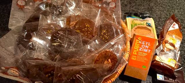 In der Vorweihnachtszeit buken wir Lebkuchen aus regionalen und fairen Zutaten. So wurden Omas Walnüsse zusammen mit Eiern vom Bauernhof sowie Gewürzen und Kuvertüre aus fairem Handel zu weihnachtlichem Gebäck verarbeitet und hygienisch einzeln verpackt. Am Weihnachtstrubel, der traditionell am letzten Schultag vor den Weihnachtsferien stattfindet, konnten Schülerinnen und Schüler sowie Lehrkräfte am Fairtrade-Verkaufsstand Lebkuchen in zwei verschiedenen Größen erstehen.